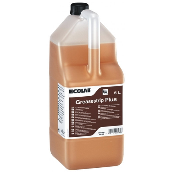 Потужний знежирюючий лужний засіб Greasestrip plus (Грізстріп Плюс) для чищення обладнання, яке бере участь у приготуванні їжі та інших складних кухонних забруднень. Підходить для видалення пригорілих жирових забруднень з поверхонь пароконвектоматів, грилів, витяжок тощо. Добре видаляє навіть застарілі пригари. Не застосовуйте на чутливих до лугу поверхнях.